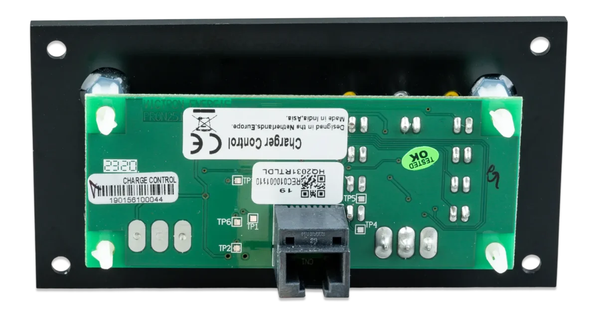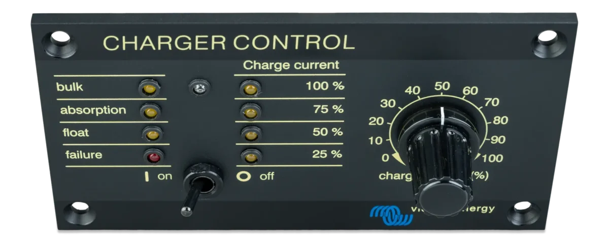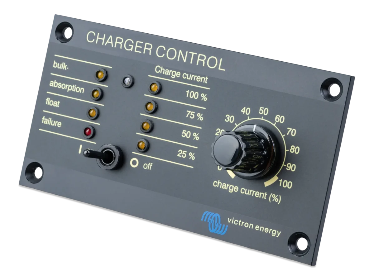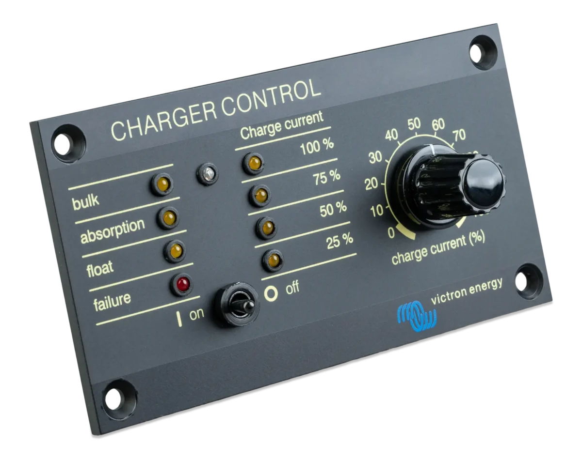 Ο πίνακας Charger Control παρέχει τη δυνατότητα τηλεχειρισμού και επιτήρησης της διαδικασία φόρτισης με LED που δείχνει την κατάσταση του φορτιστή. Επιπλέον, ο απομακρυσμένος πίνακας παρέχει επίσης τη δυνατότητα ρύθμισης της απόδοσης ισχύος και μπορεί να χρησιμοποιηθεί για τον περιορισμό της έντασης ισχύος και, έτσι, της ισχύος που αναλίσκεται από την παροχή AC. Αυτό είναι ιδιαίτερα χρήσιμο όταν ο φορτιστής λειτουργεί με περιορισμένη ισχύ ξηράς ή μικρά ηλεκτροπαραγωγά ζεύγη. Ο πίνακας μπορεί επίσης να χρησιμοποιηθεί για την αλλαγή των παραμέτρων φόρτισης της μπαταρίας. Η φωτεινότητα των LED μειώνεται αυτόματα στη διάρκεια της νύχτας. Η σύνδεση στο φορτιστή γίνεται μέσω ενός τυπικού καλωδίου UTP.