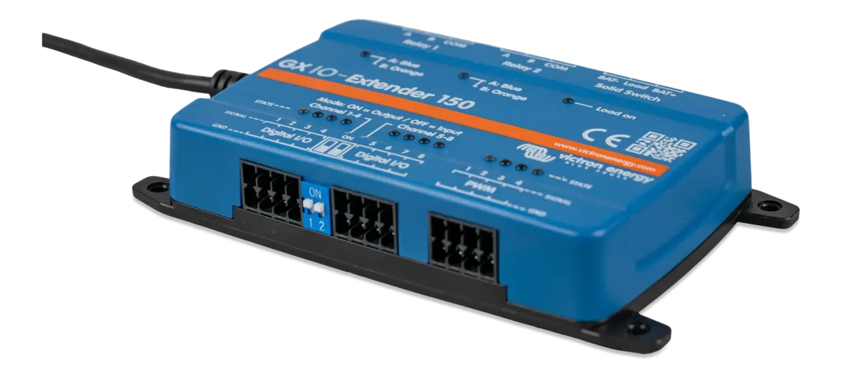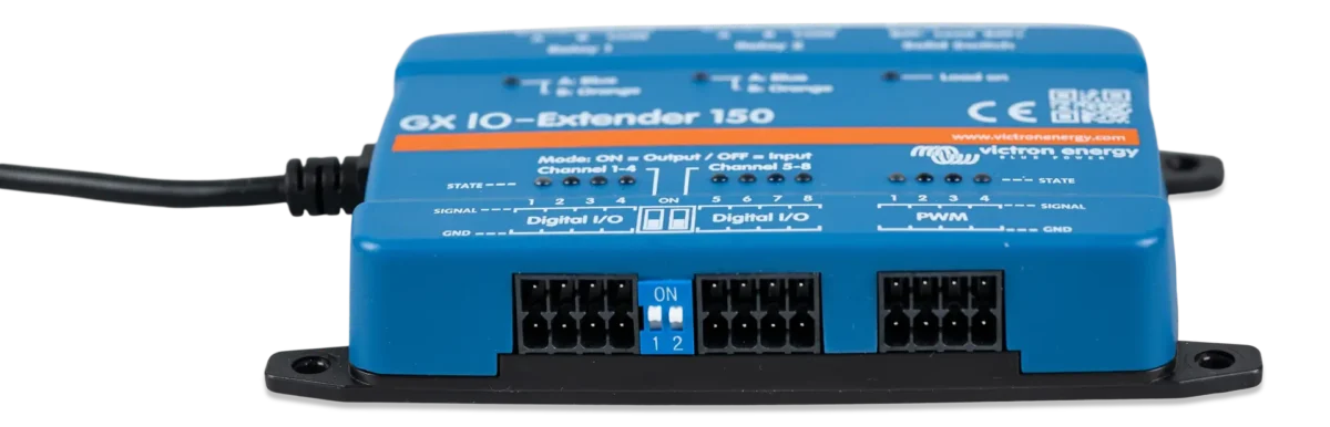 The GX IO-Extender 150 ενισχύει τις δυνατότητες εισόδου και εξόδου (I/O) μιας συσκευής GX, επιτρέποντας την απρόσκοπτη σύνδεσή της με πρόσθετους αισθητήρες, χειριστήρια και εξωτερικές συσκευές. Συνδέεται μέσω ενός USB, ο οποίος λειτουργεί και ως πηγή ισχύος του, αποτελώντας μια απλή και αποτελεσματική λύση επέκτασης. Η συσκευή μπορεί να ελεγχθεί με τη χρήση του Node-RED στη συσκευή GX, καθώς και του πλαισίου με διακόπτες στη διεπαφή χρήστη.